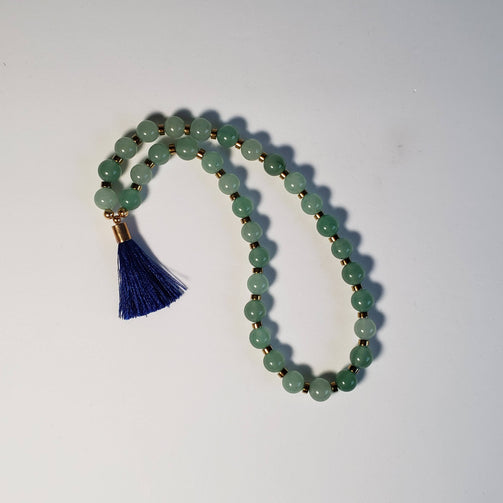 A stunning translucent green aventurine stone with gold accents is complimented by a royal blue tassel.