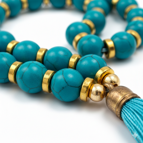 This elegant bracelet made with turquoise colored stones and gold accents can be used as a 33 bead tasbih/misbaha. Coordinate with your outfit or keep handy next to your prayer mat.